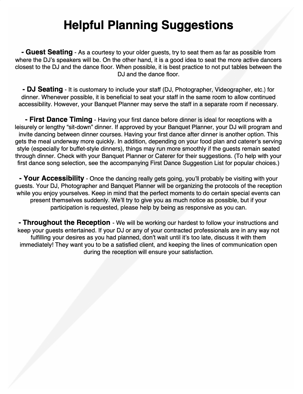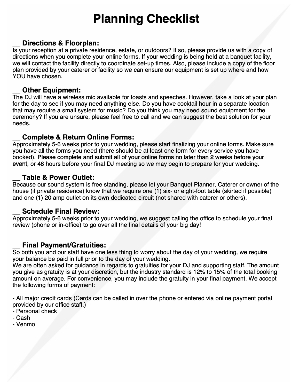 We are excited to provide you with our Wedding Checklist to help guide you, as well as offer some helpful planning suggestions that you may want to consider when coordinating your day. Feel free to view and download both lists to use at your convenience.