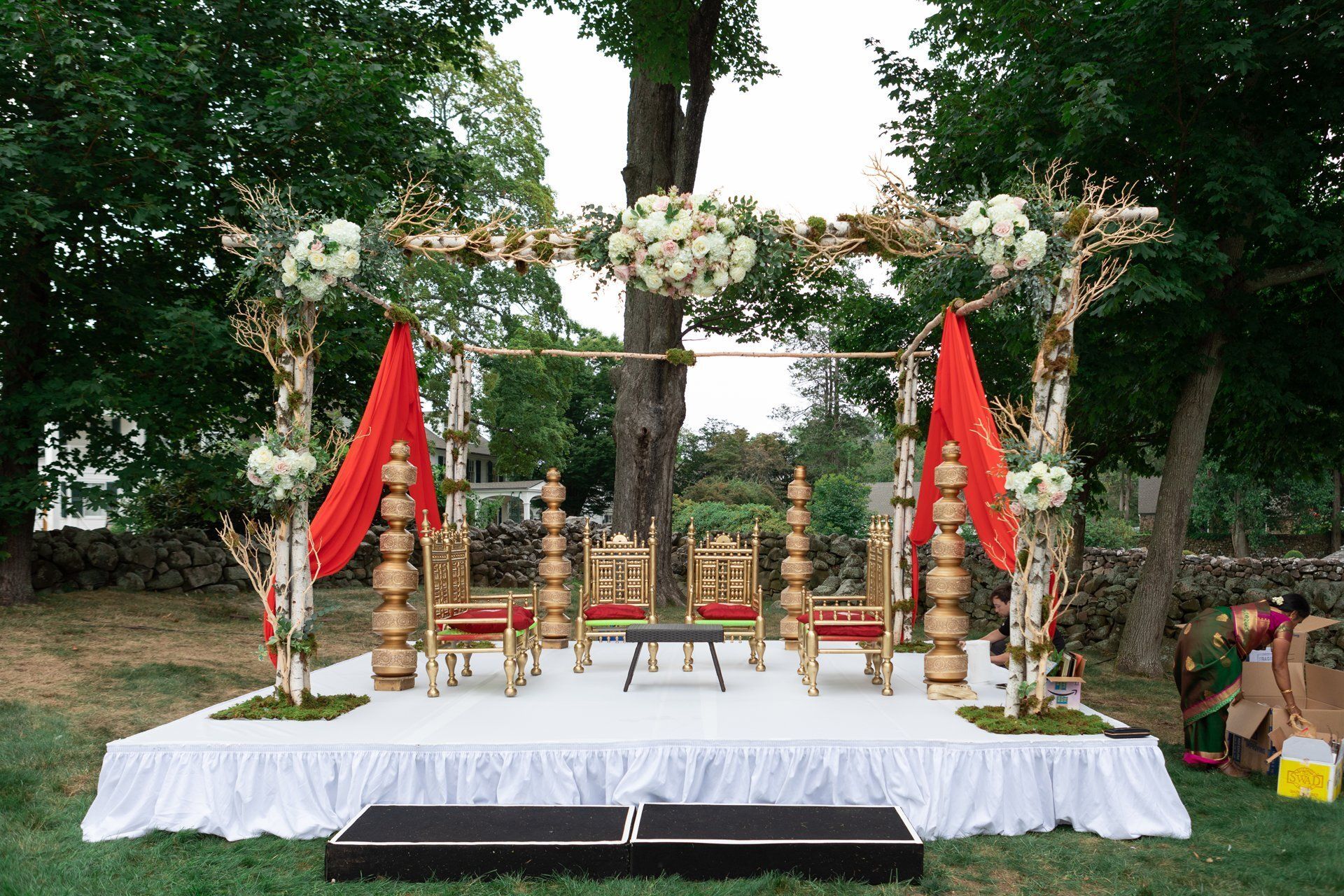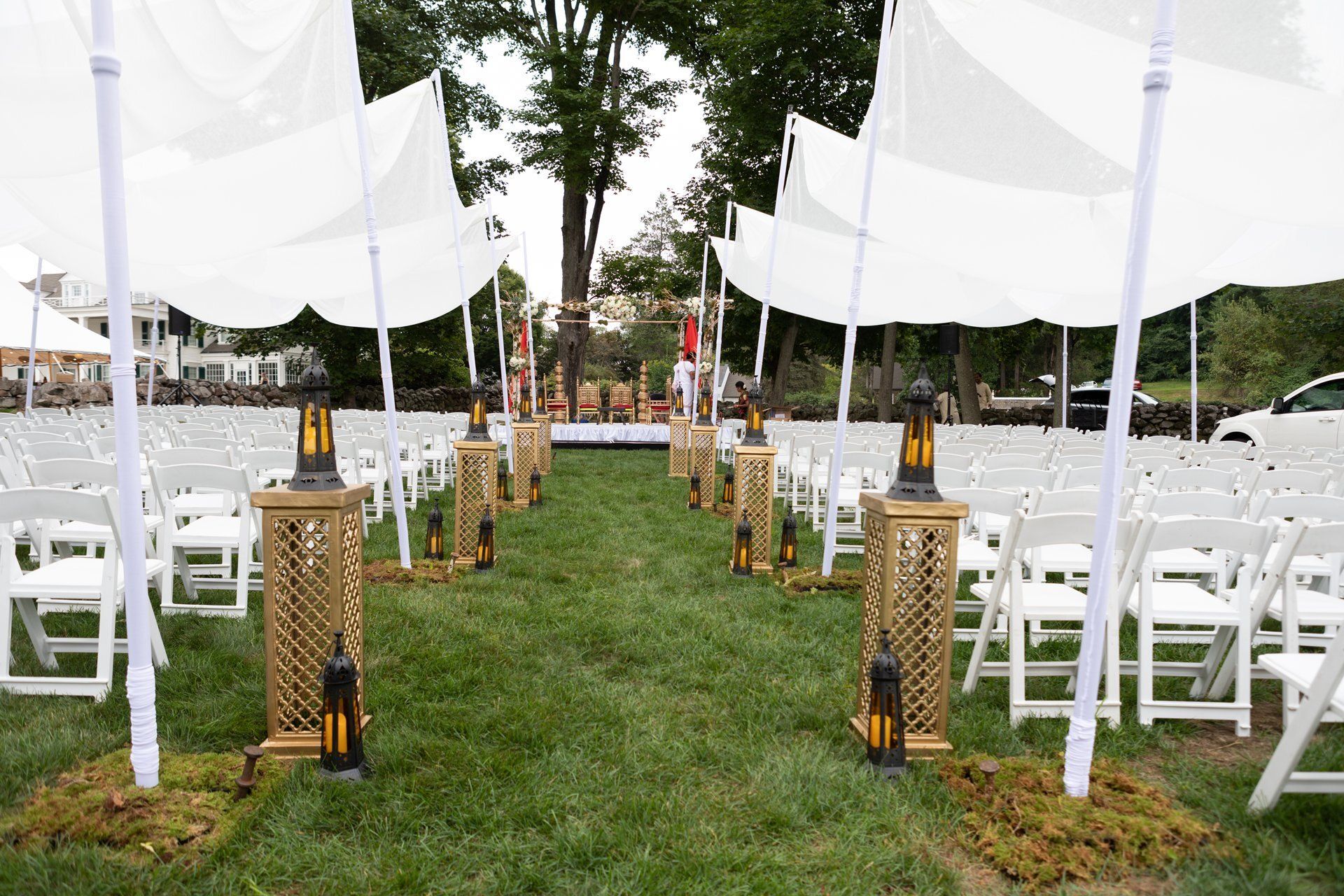 Day two brought the celebration to the Hill-Stead Museum in Farmington, CT where our wedding planners and decor team coordinated the construction of both the Hindu and American ceremony sites. The Hindu ceremony included a custom-designed and built mandap and sunshade for guests.