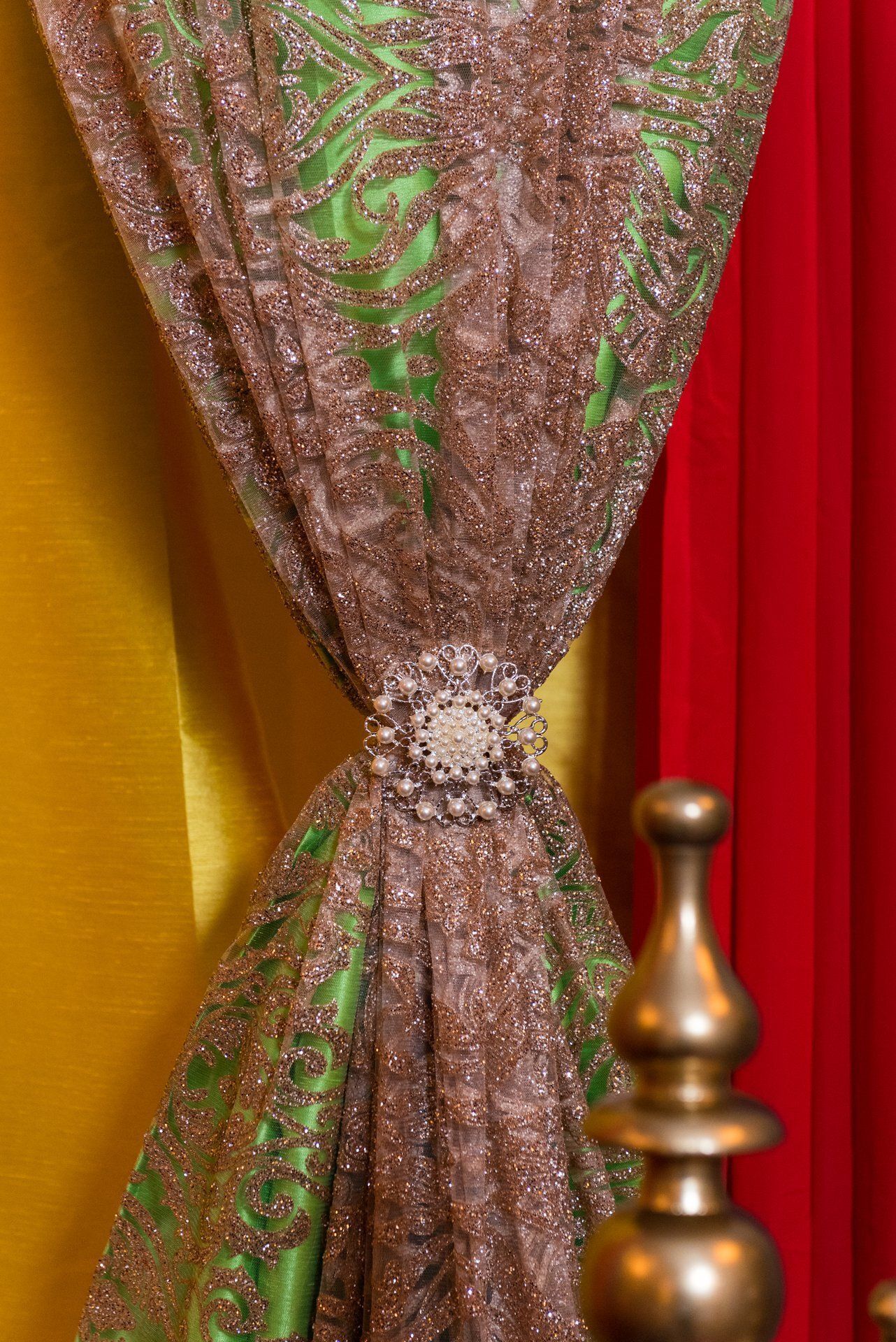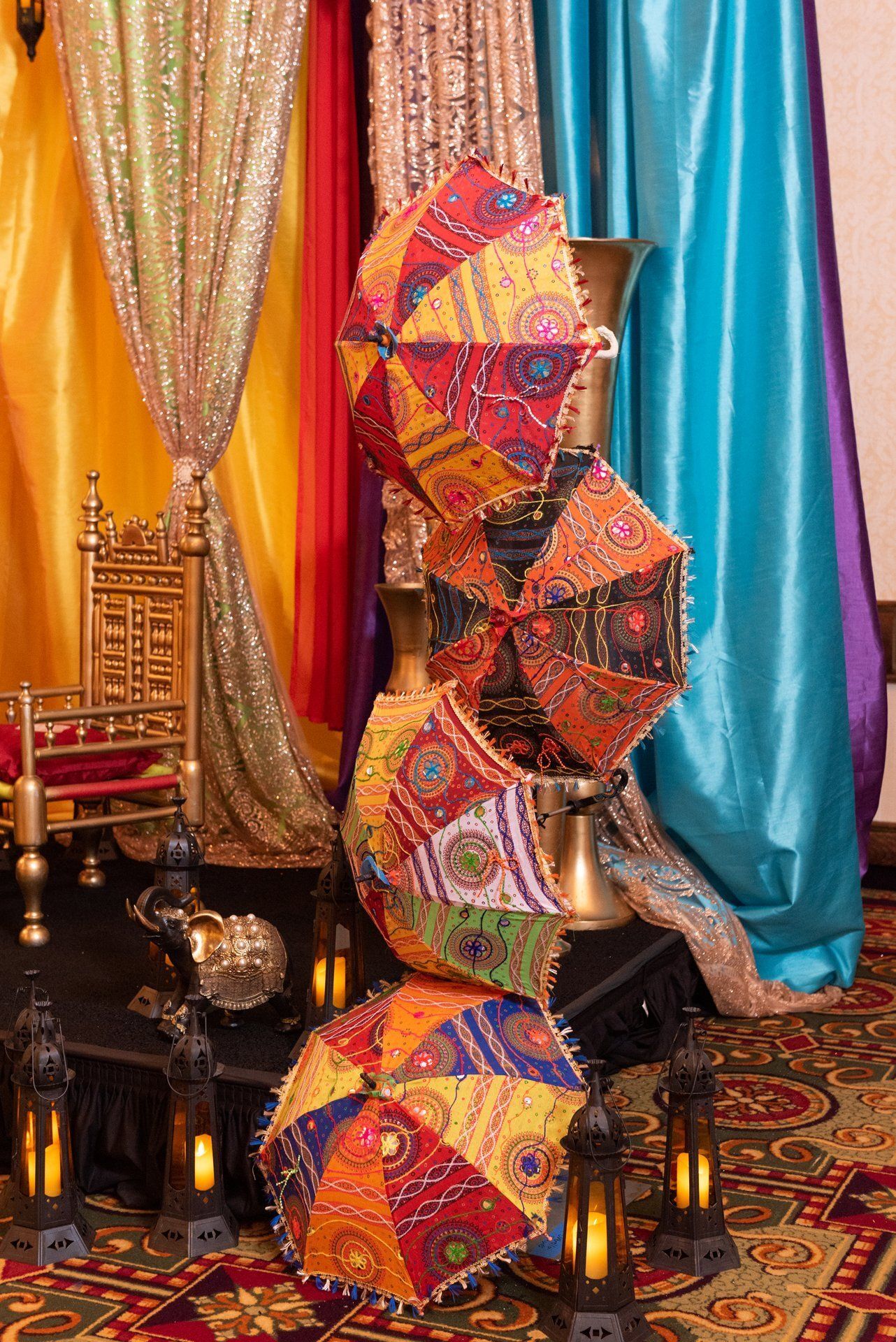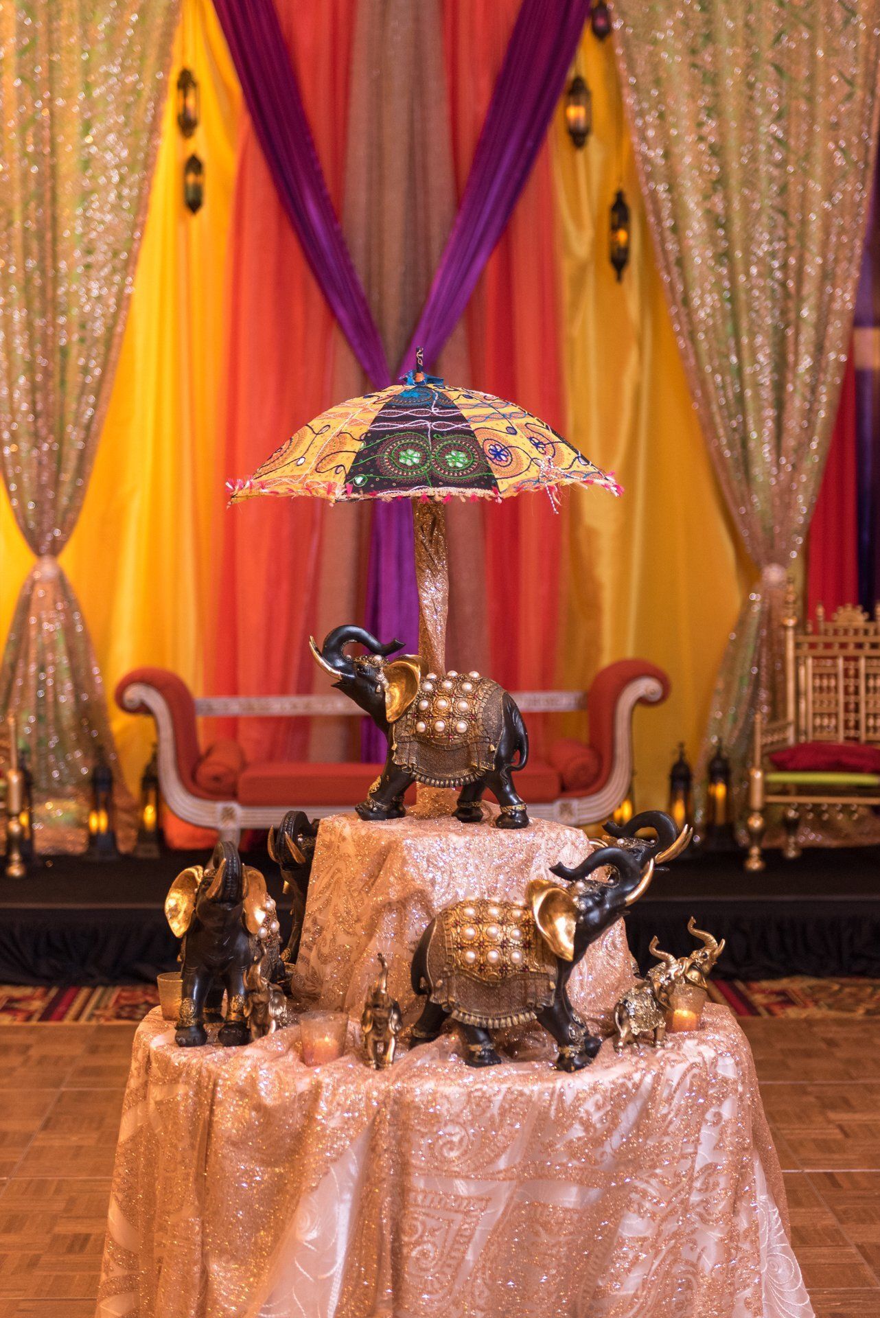 Ali and Vijay's multi-cultural wedding was a stunning three-day celebration with friends and family in attendance. Our decor team designed a custom colorful draped backdrop for the Sangeet and included countless gold accents and eye-catching textures and patterns.