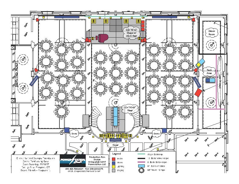 Our expert team will work closely with you to build your event from the ground up. Taking into consideration your event space, power distribution, guest count and your event needs, we'll develop an organized, easy-to-read floor plan that our technical crew will refer to as they begin setup. A clear and concise layout will help our staff and your staff navigate the space prior to and during your event.