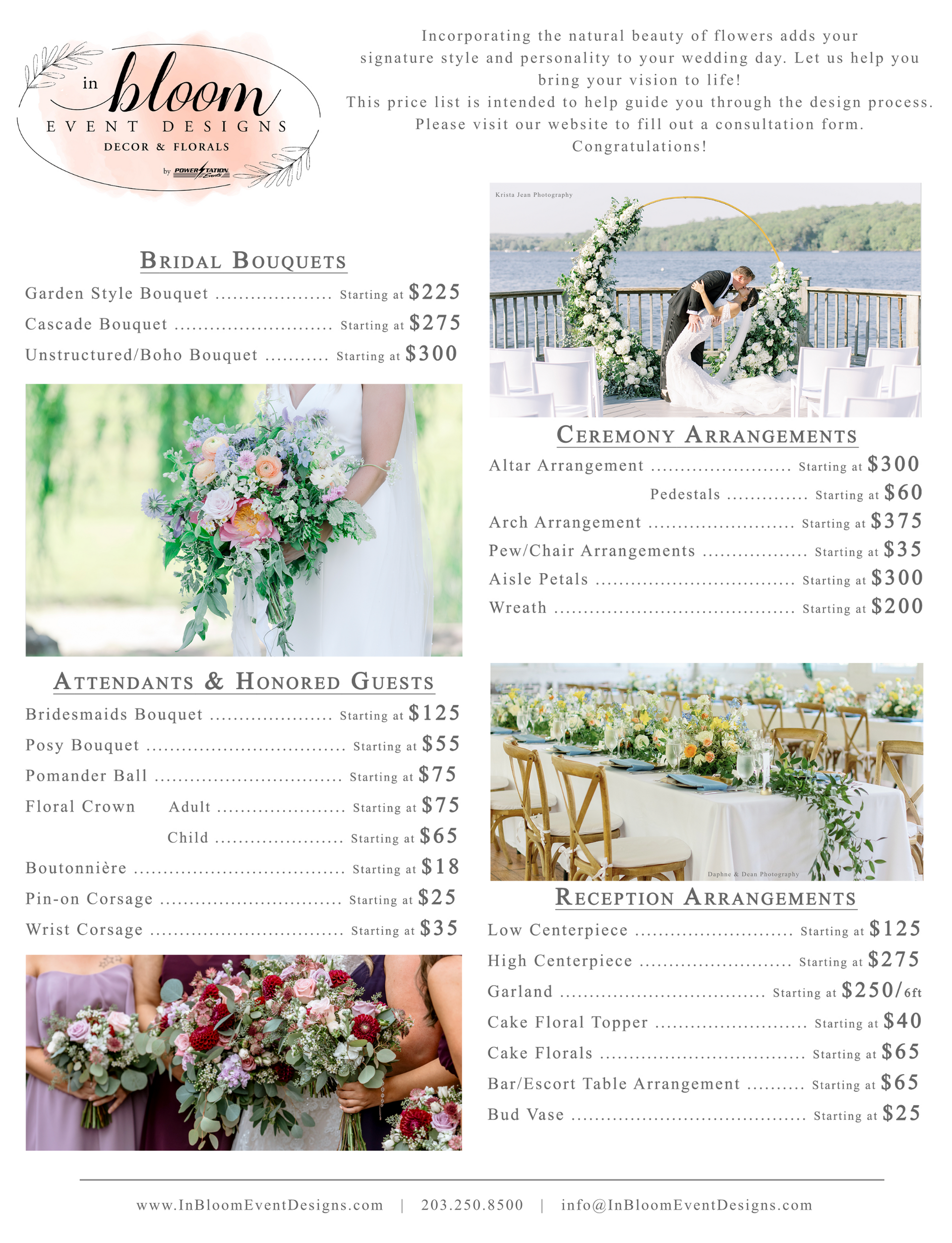 You can find all of our Connecticut Wedding Group materials on this page. View, download or print each of our booklets, brochures and price sheets to better understand our services and the ways in which we can make your perfect wedding a reality!