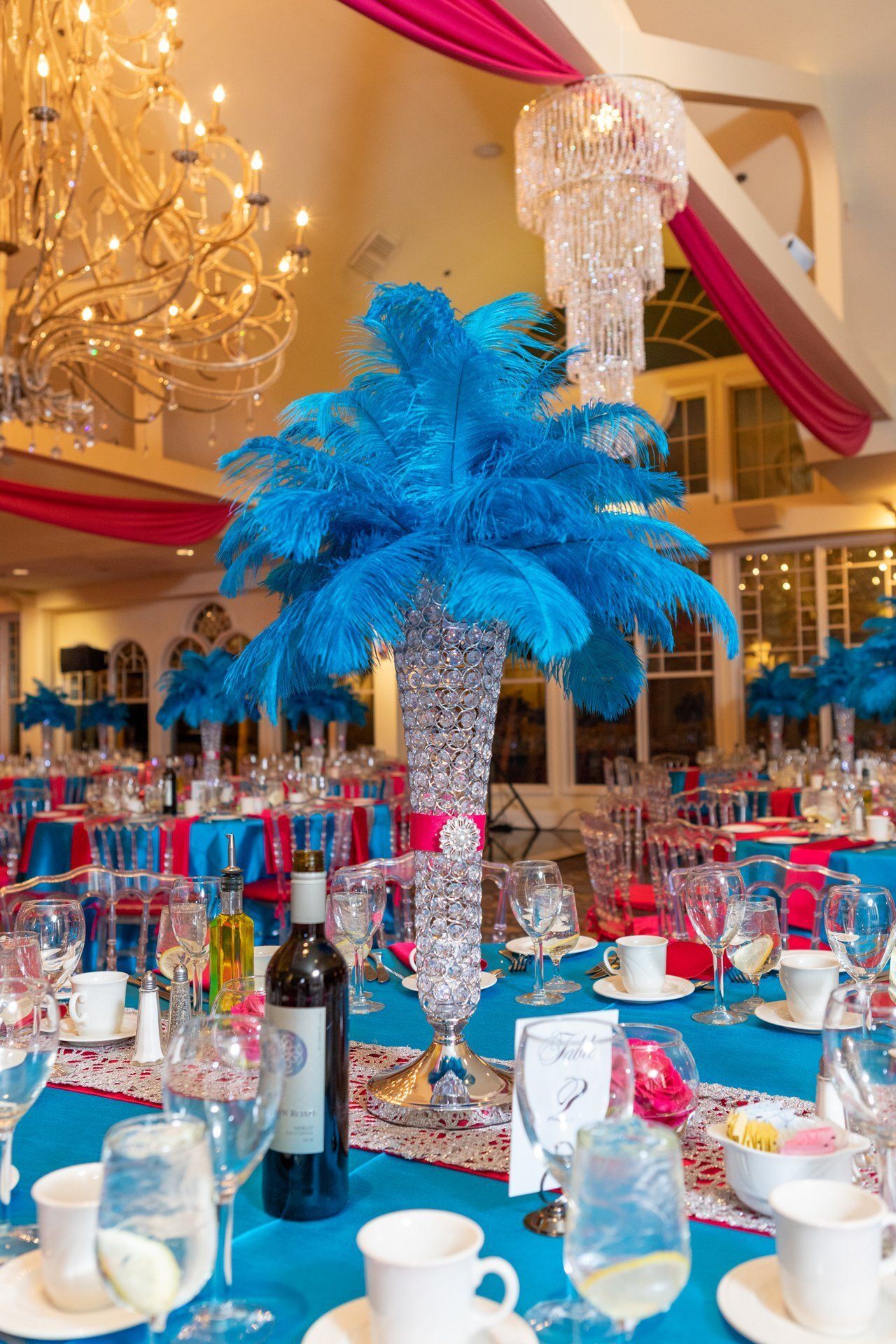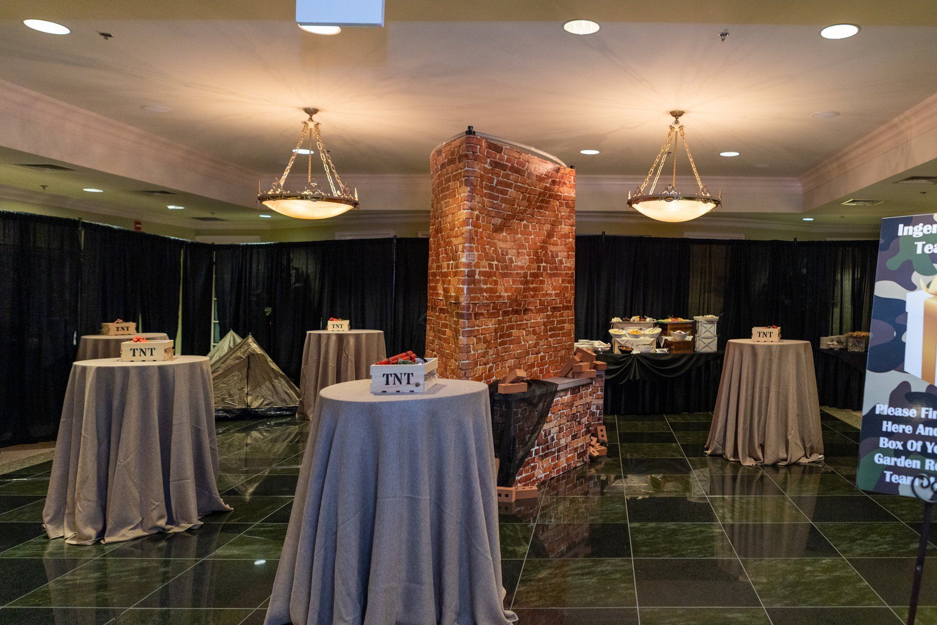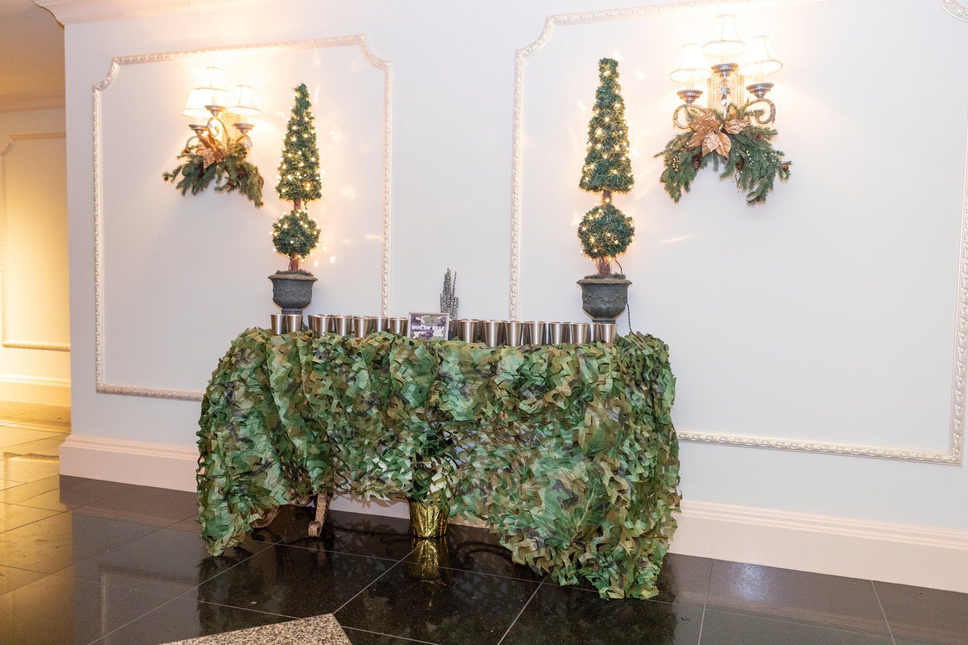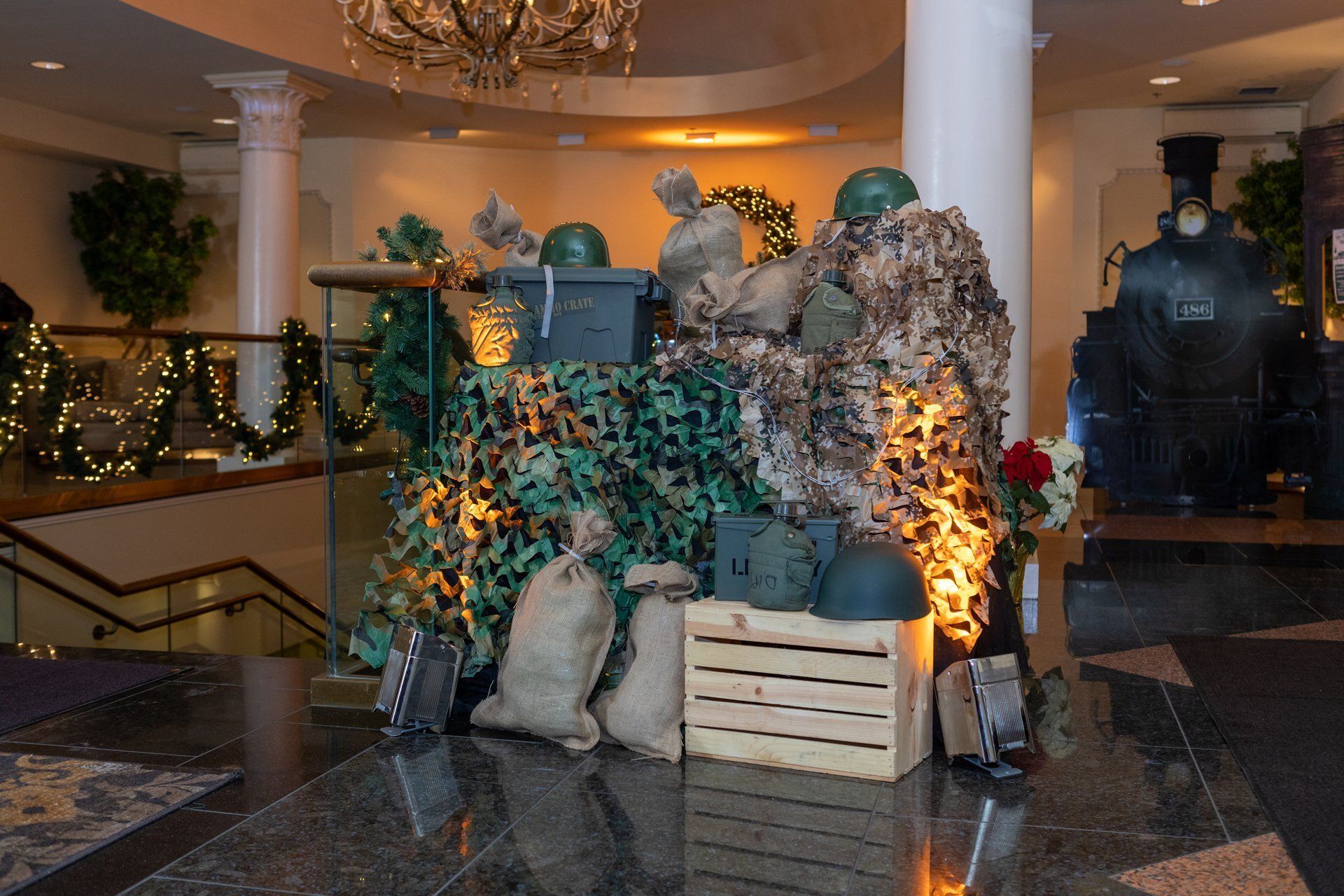 As guests entered through the main foyer, they are transported in to the battlefield during World War II where the film begins. Cocktail hour was decorated with sandbags, dynamite and field hospital decor. In the movie, the characters hop on a train to Pine Tree, Vermont for a stay at the Colombia Inn. As the scenery changes from bleak to bright in the film, our decor team transformed the lower and upper floors of the venue respectively.