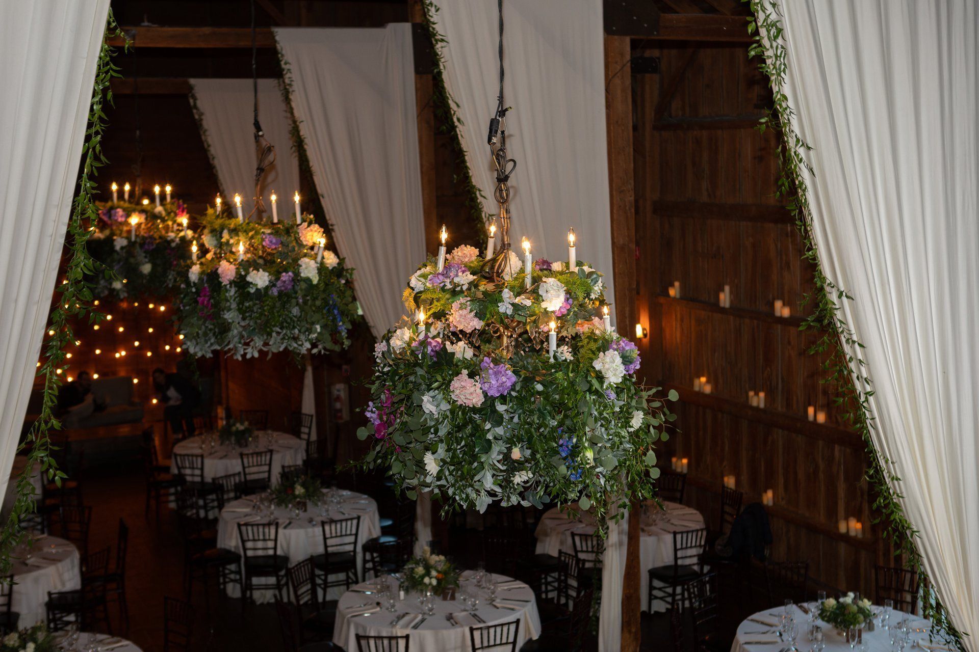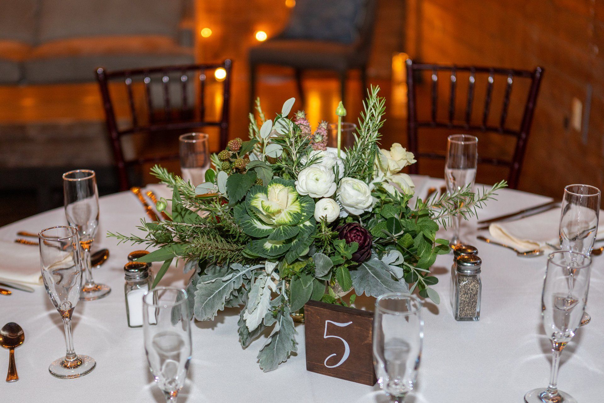 For the reception at The Barns, In Bloom Event Design provided food-themed centerpieces and bud vases for all dinner tables. The arrangements included heads of cabbage, miniature pineapples, radishes, peppers, artichokes and more mixed with herbs like rosemary and thyme.