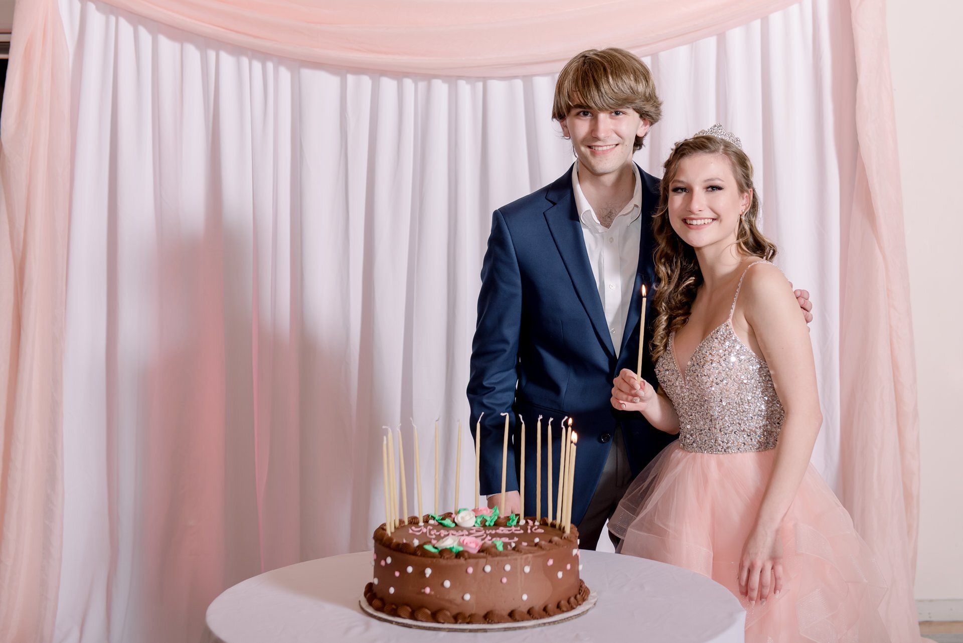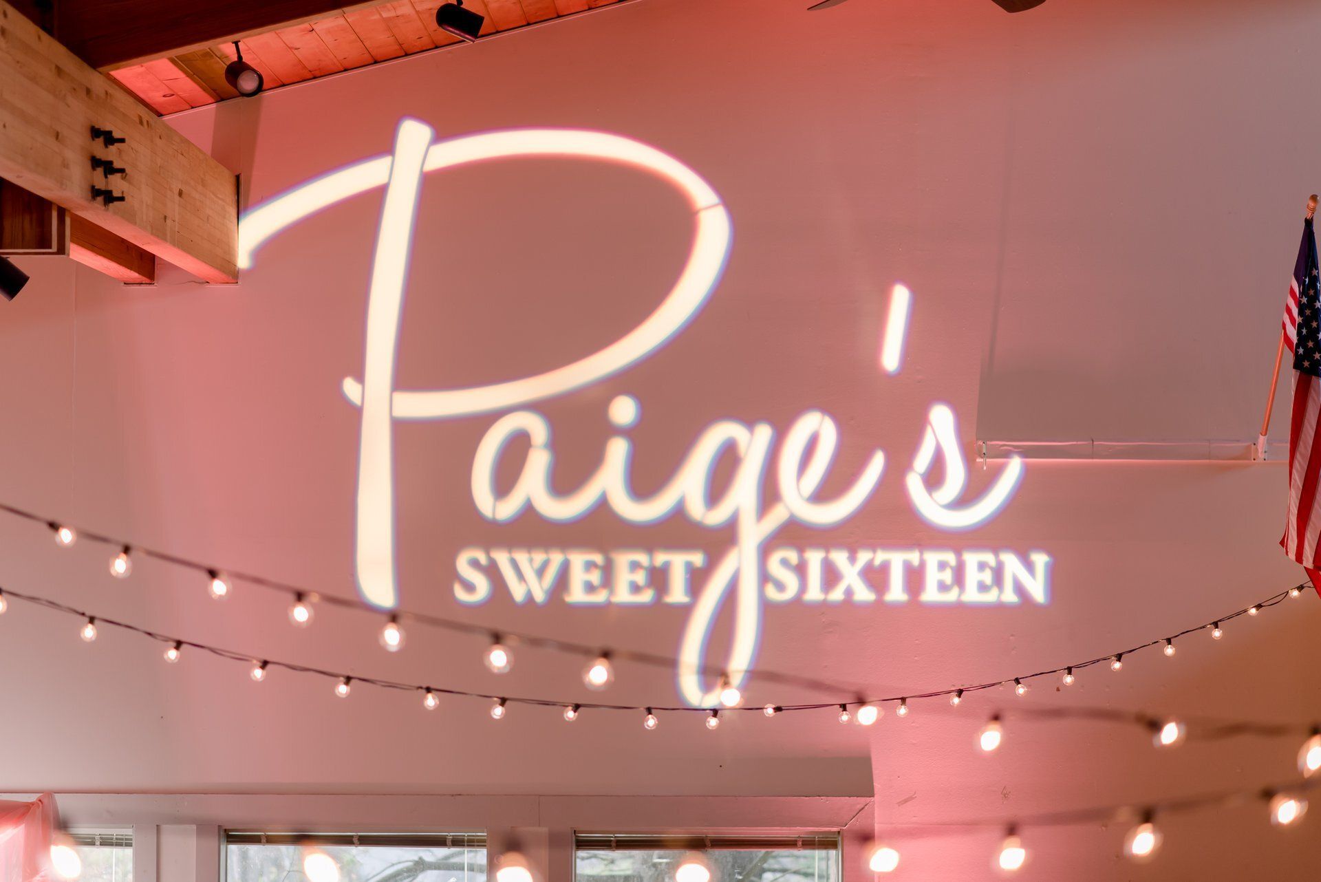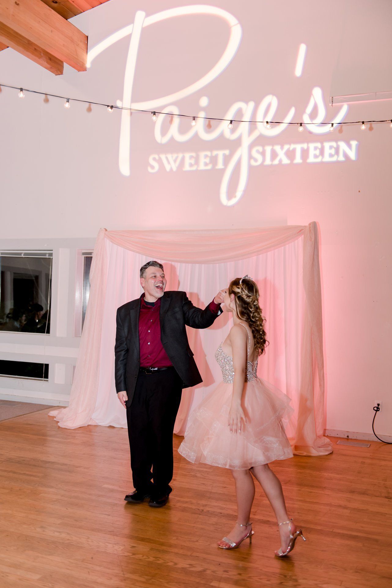Paige's rose gold-themed sweet sixteen birthday party was definitely one for the books! Our floral and decor teams designed simple, yet gorgeous, floral arrangements for the tables, a white and blush sheer backdrop, and hung string lights in the venue. Powerstation Events also provided a beautiful custom gobo and pink uplighting to transform the space.