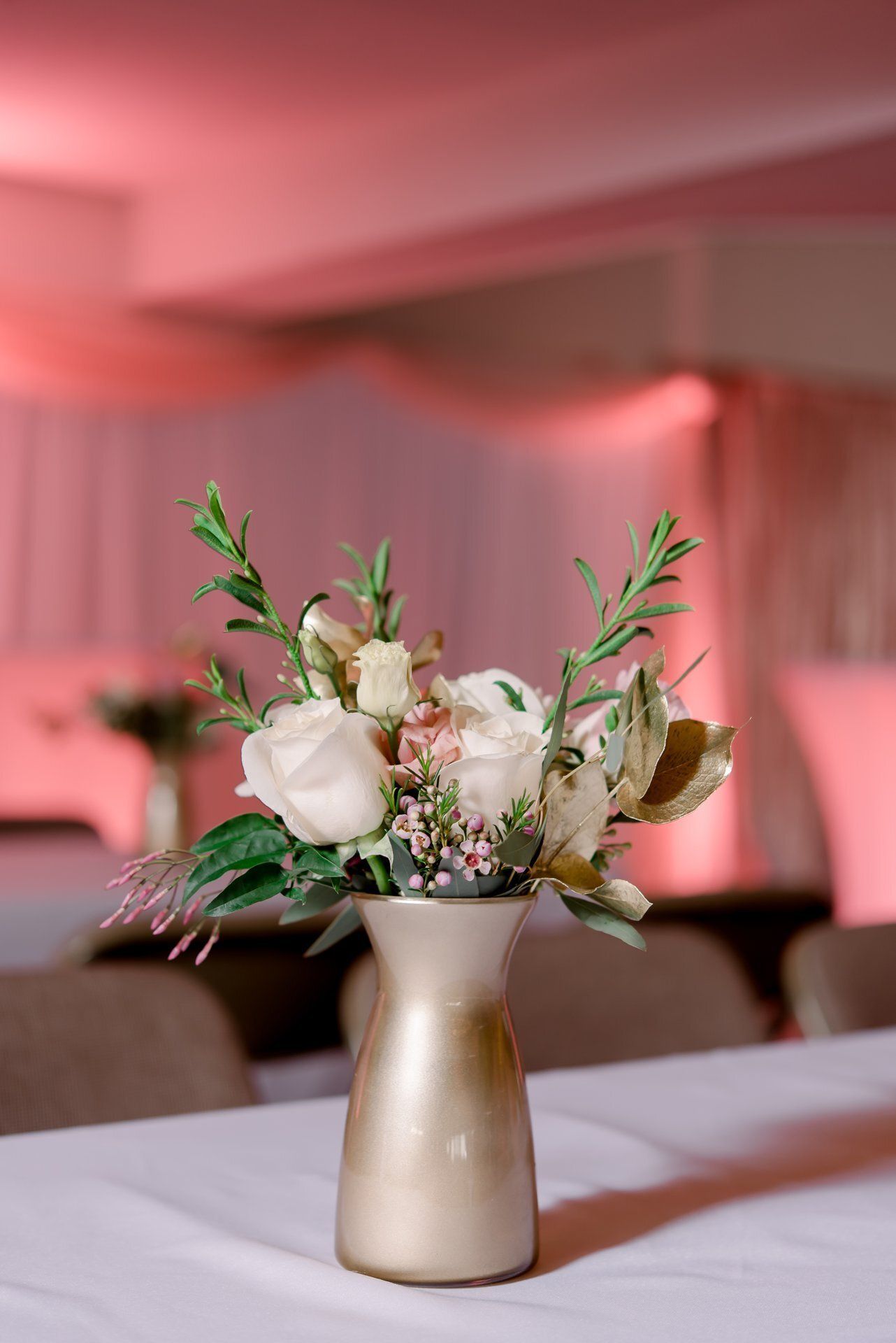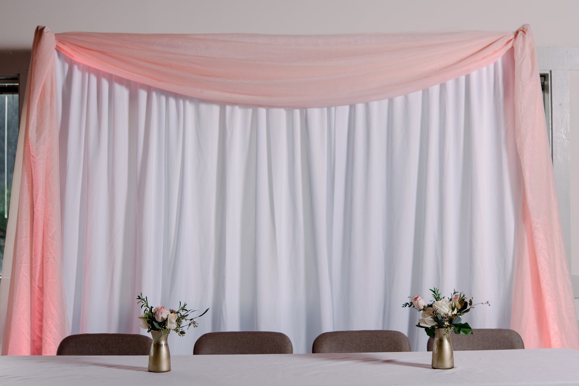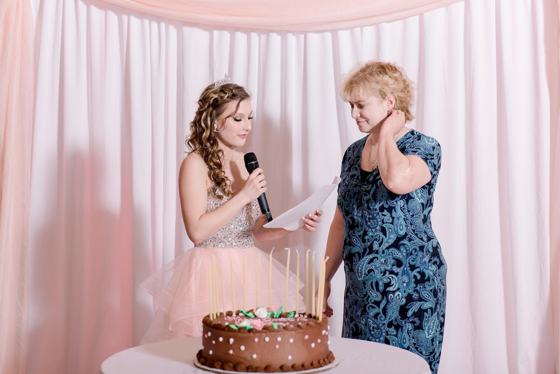 Paige's rose gold-themed sweet sixteen birthday party was definitely one for the books! Our floral and decor teams designed simple, yet gorgeous, floral arrangements for the tables, a white and blush sheer backdrop, and hung string lights in the venue. Powerstation Events also provided a beautiful custom gobo and pink uplighting to transform the space.