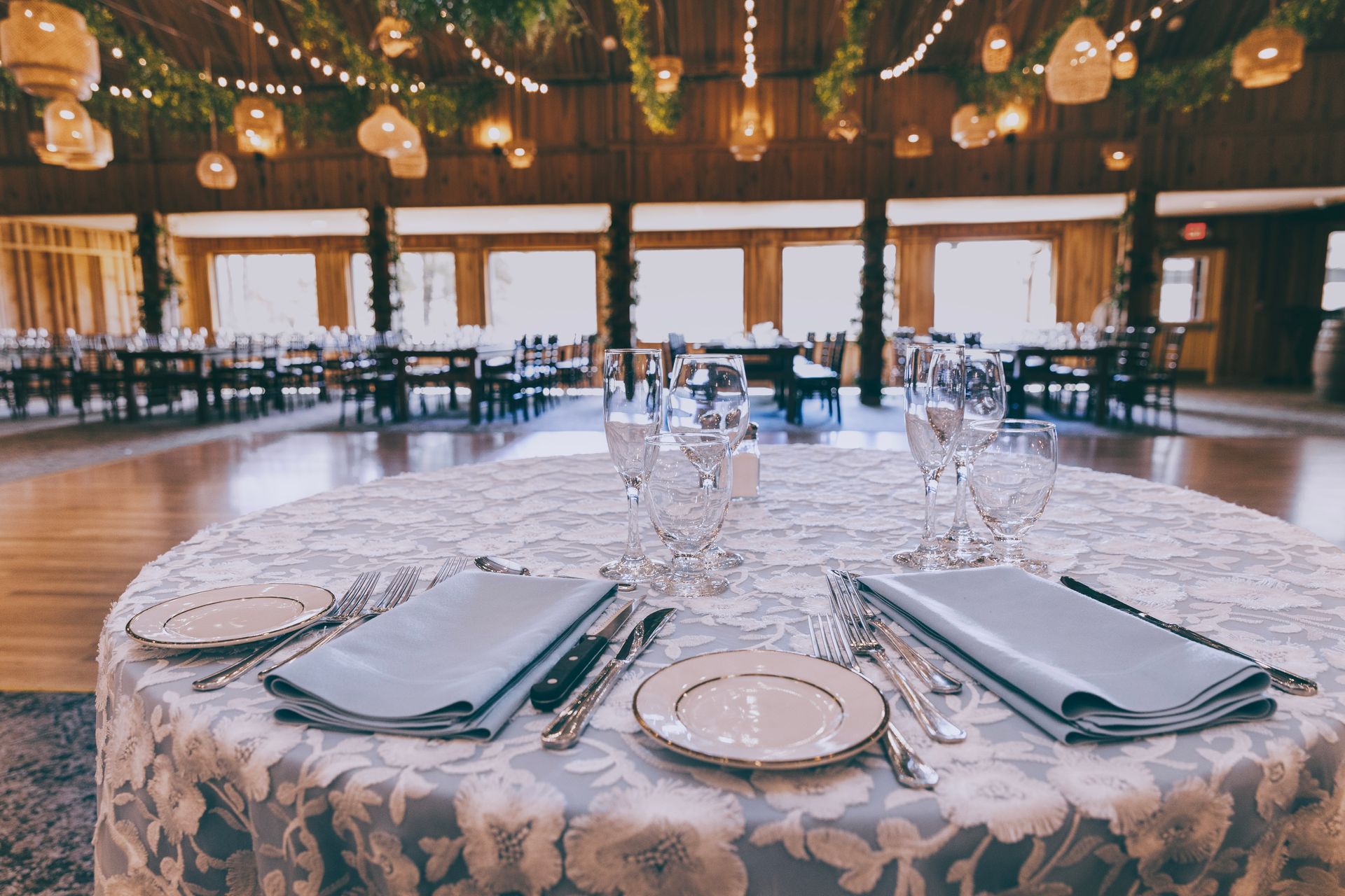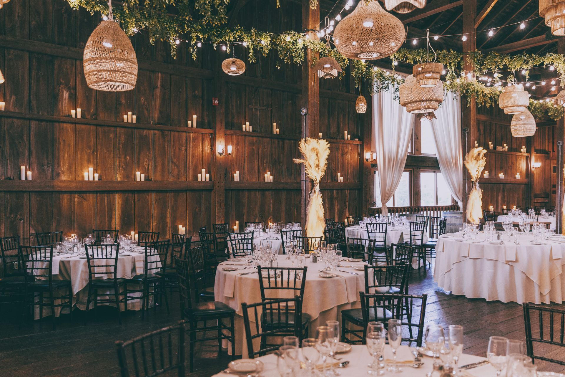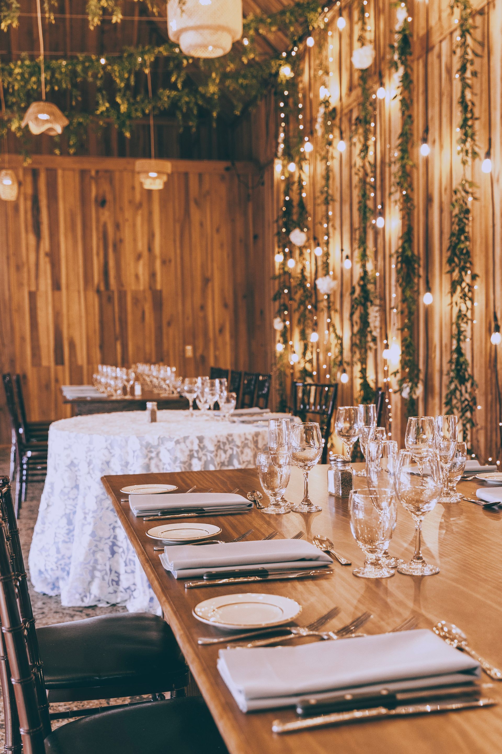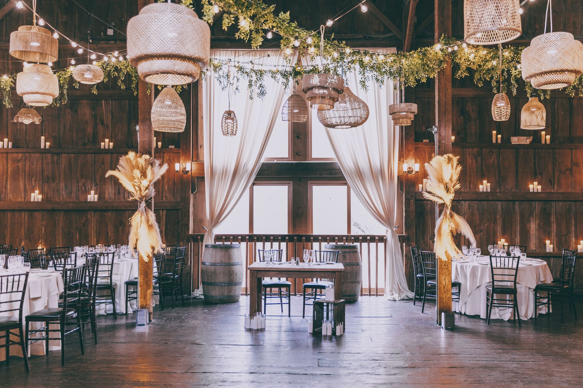 The Barnes at Wesleyan Hills. This rustic venue provides an unexpected backdrop for layering in an earthy, boho look. Garlands of verdant greenery transforms the space into a garden like atmosphere, accented with soft string lighting. Minimalist and modern tableware allows the stunning room decor to speak for itself and transport you into a dreamy affair. Ratan ceiling lights, plenty of candles, and geometric accents add depth and style to complete the look. Our