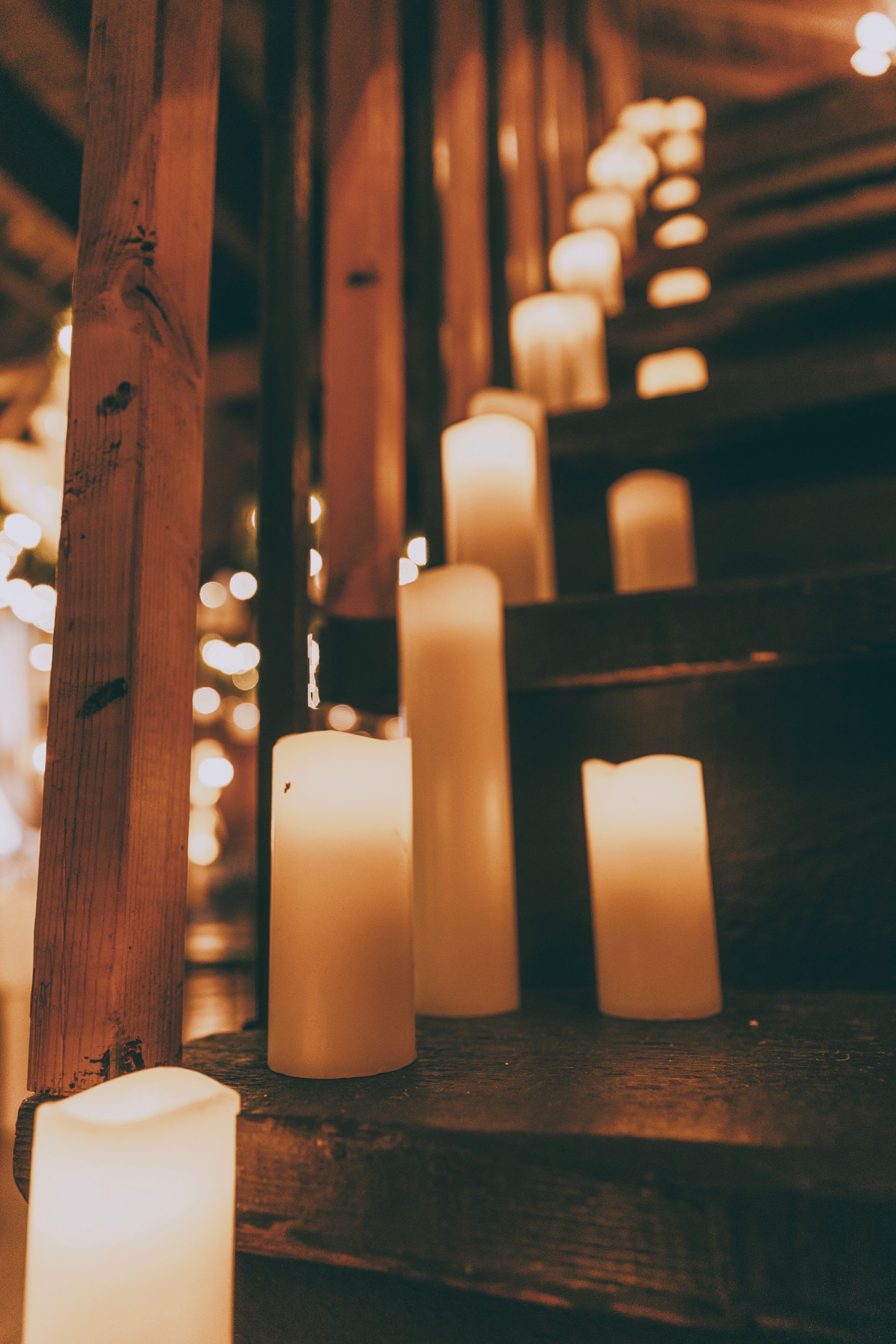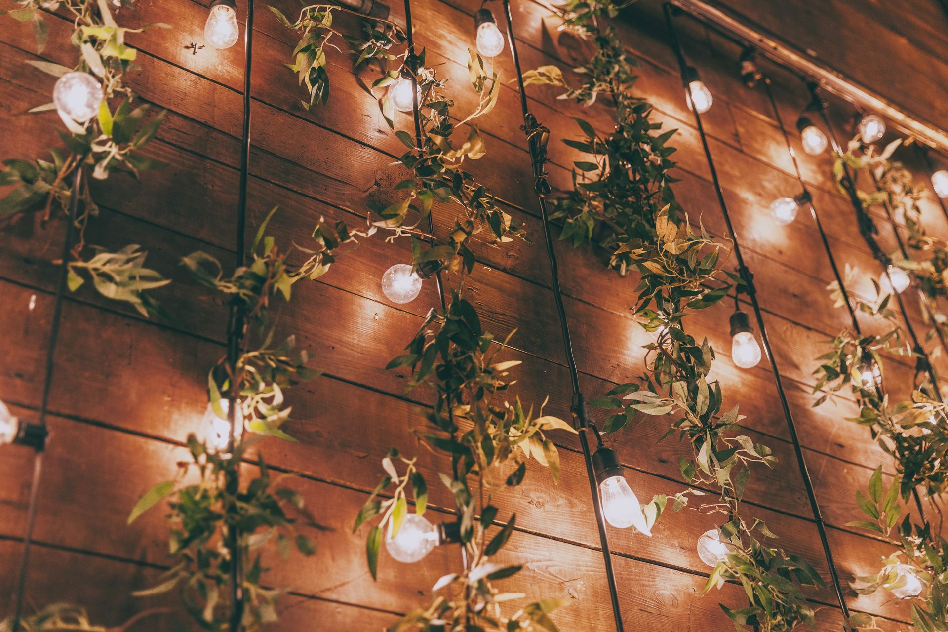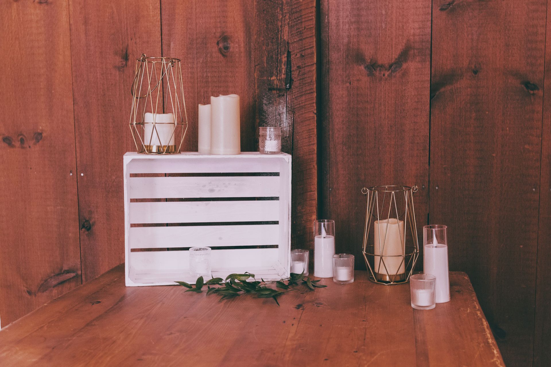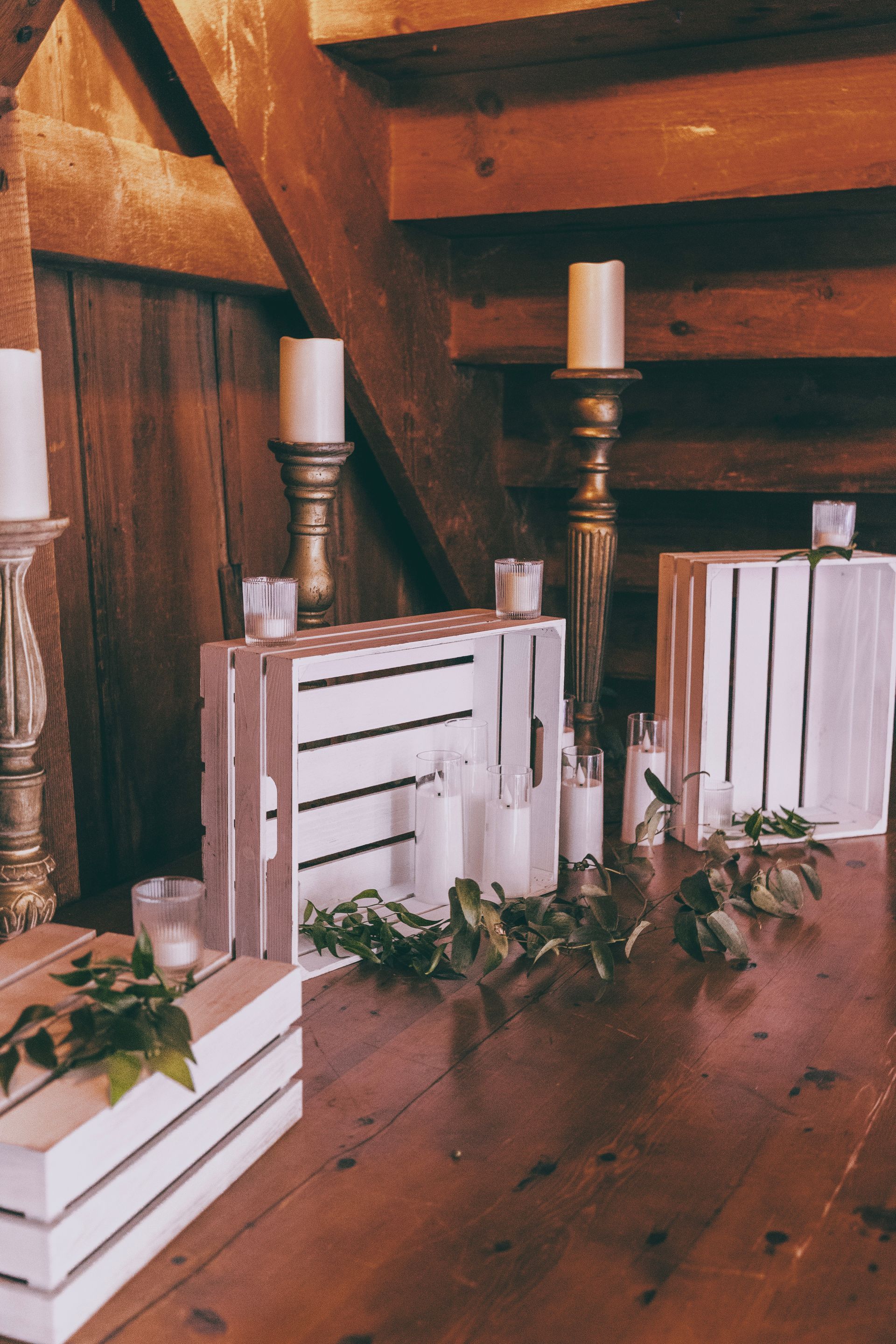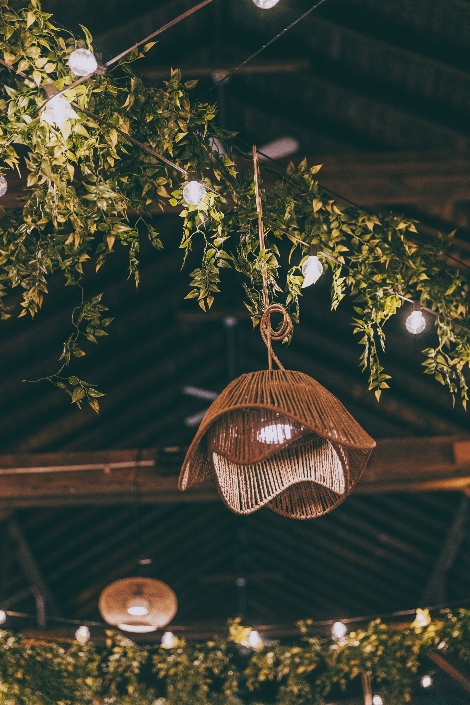 The Barnes at Wesleyan Hills. This rustic venue provides an unexpected backdrop for layering in an earthy, boho look. Garlands of verdant greenery transforms the space into a garden like atmosphere, accented with soft string lighting. Minimalist and modern tableware allows the stunning room decor to speak for itself and transport you into a dreamy affair. Ratan ceiling lights, plenty of candles, and geometric accents add depth and style to complete the look. Our