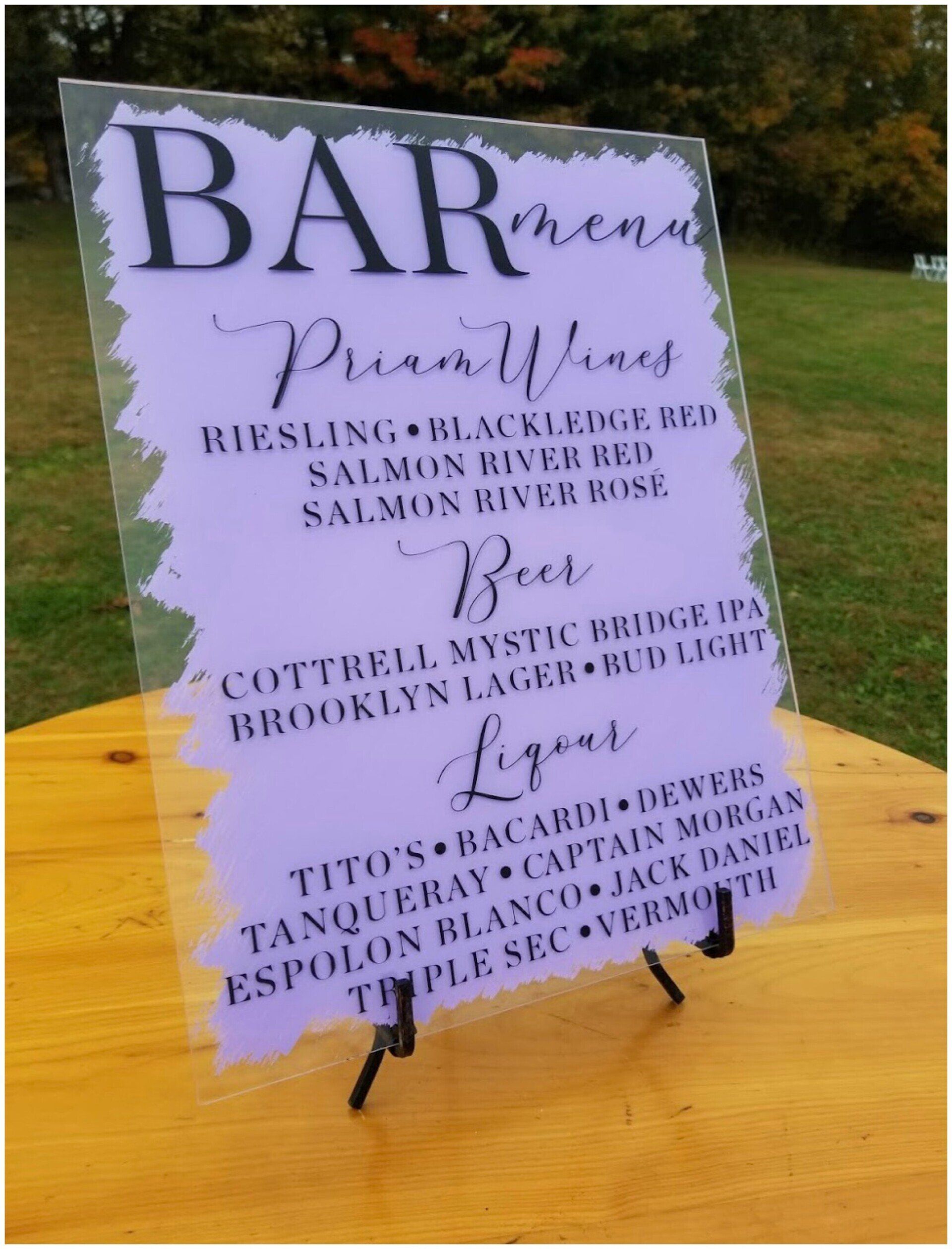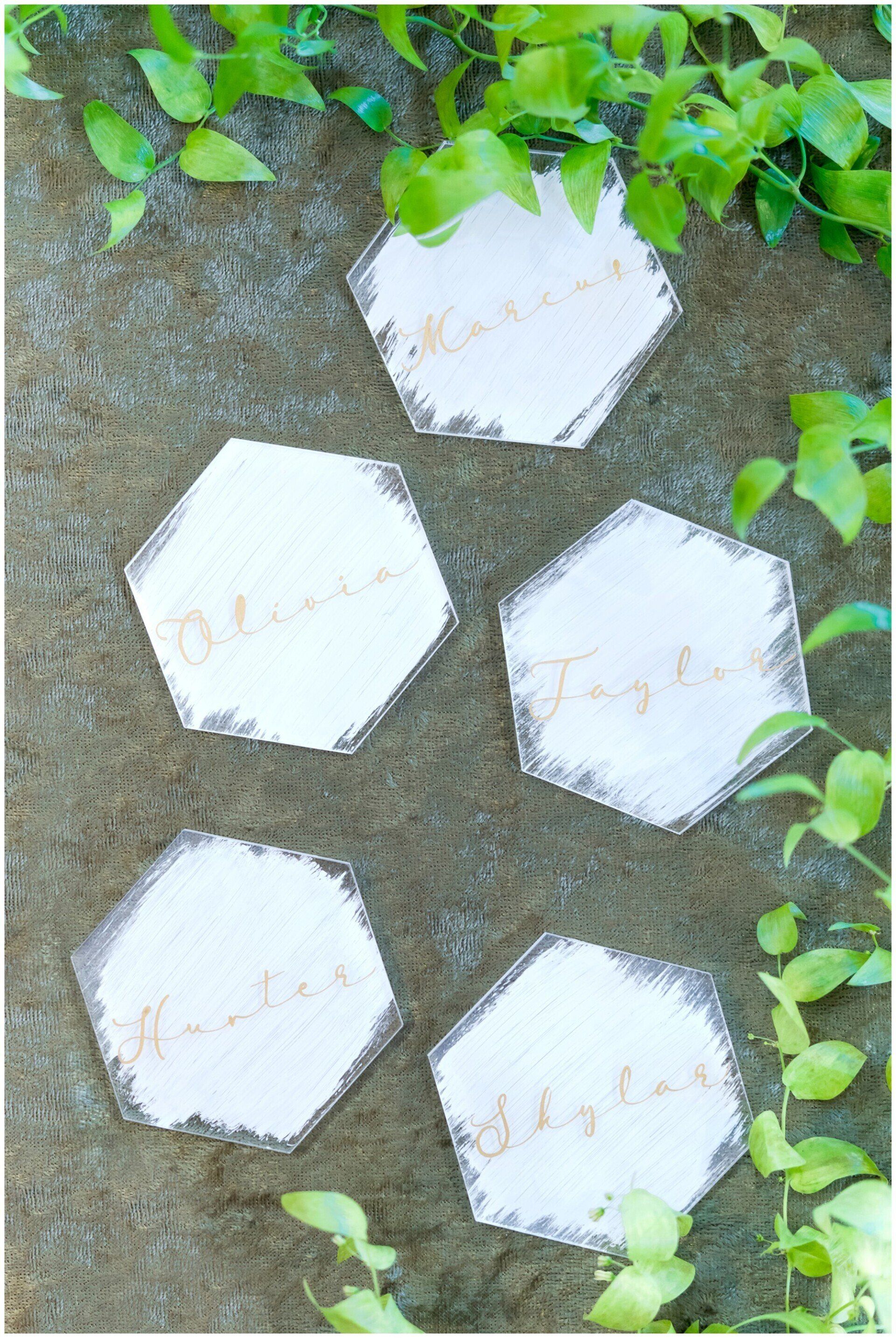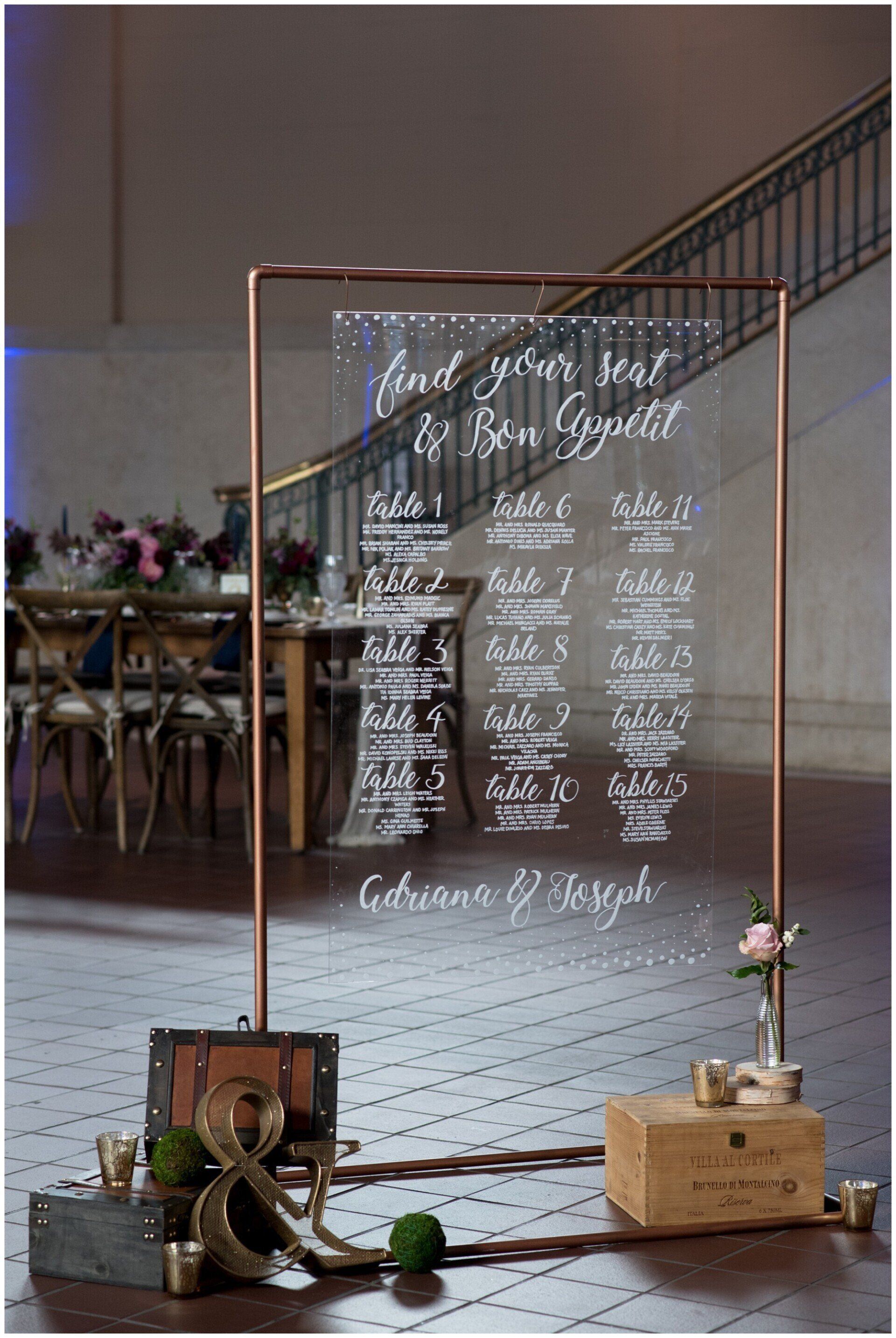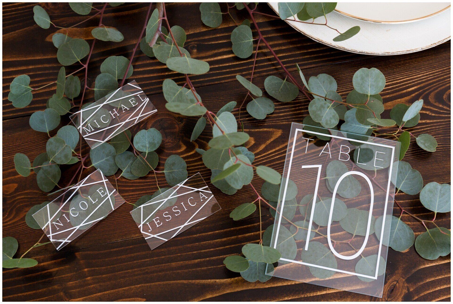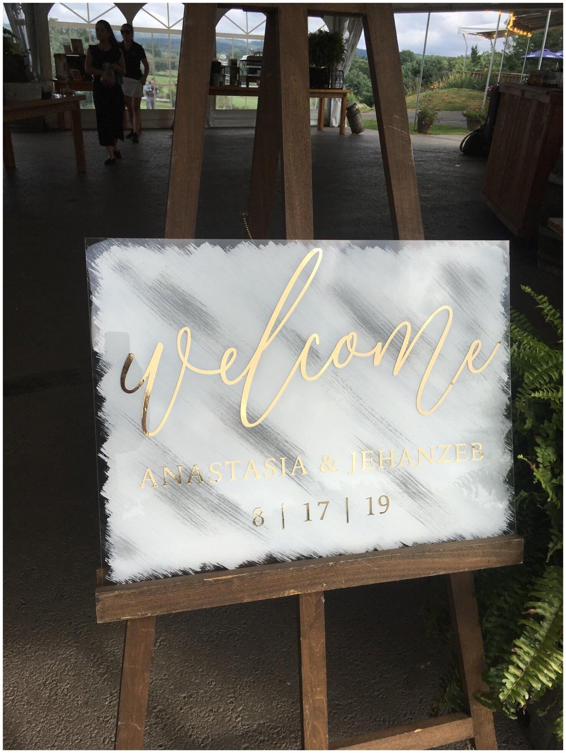 Personalize your wedding with pieces made on your choice of material from wood, clear and colored acrylic, mirror, chalkboard, printed products or even organics.