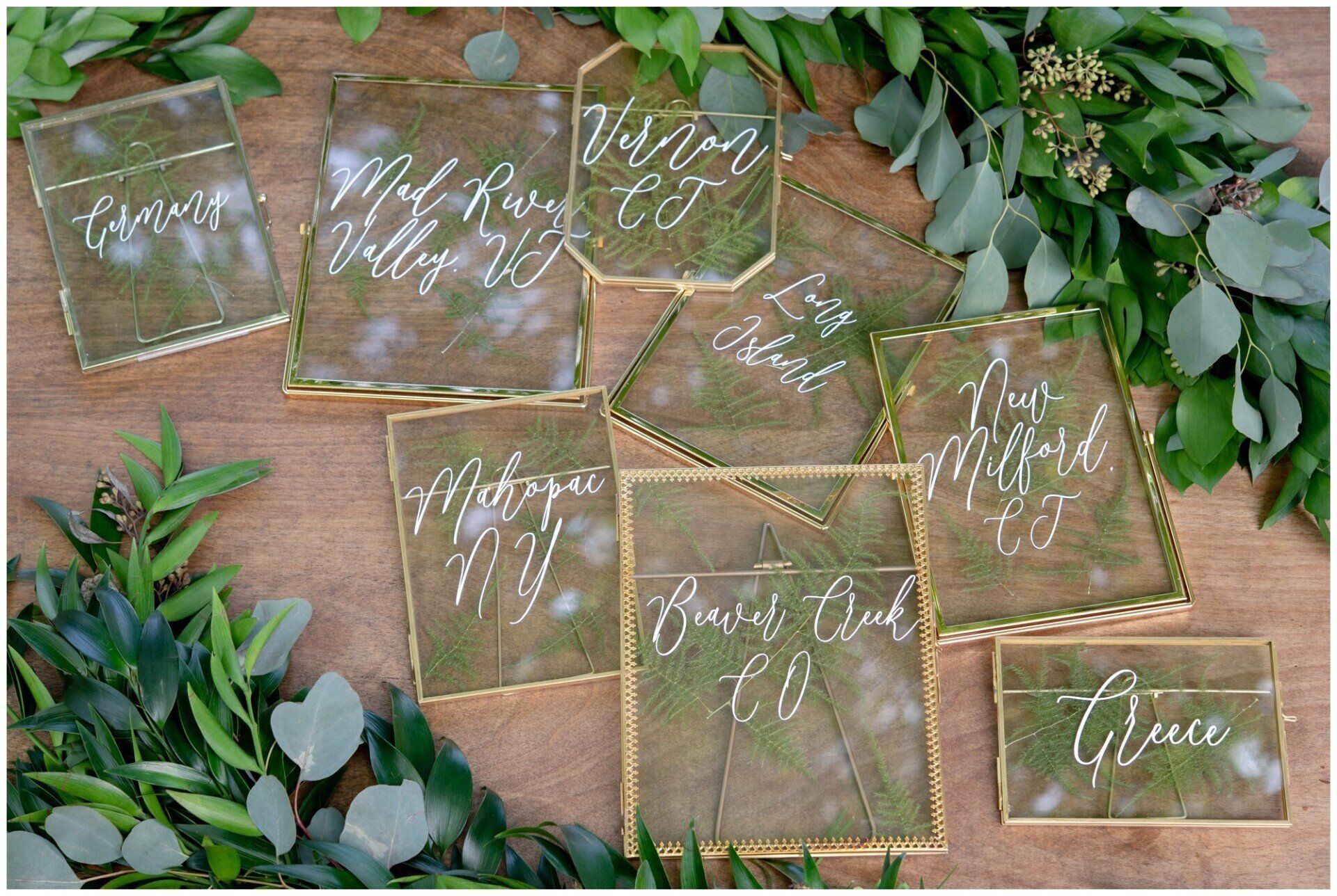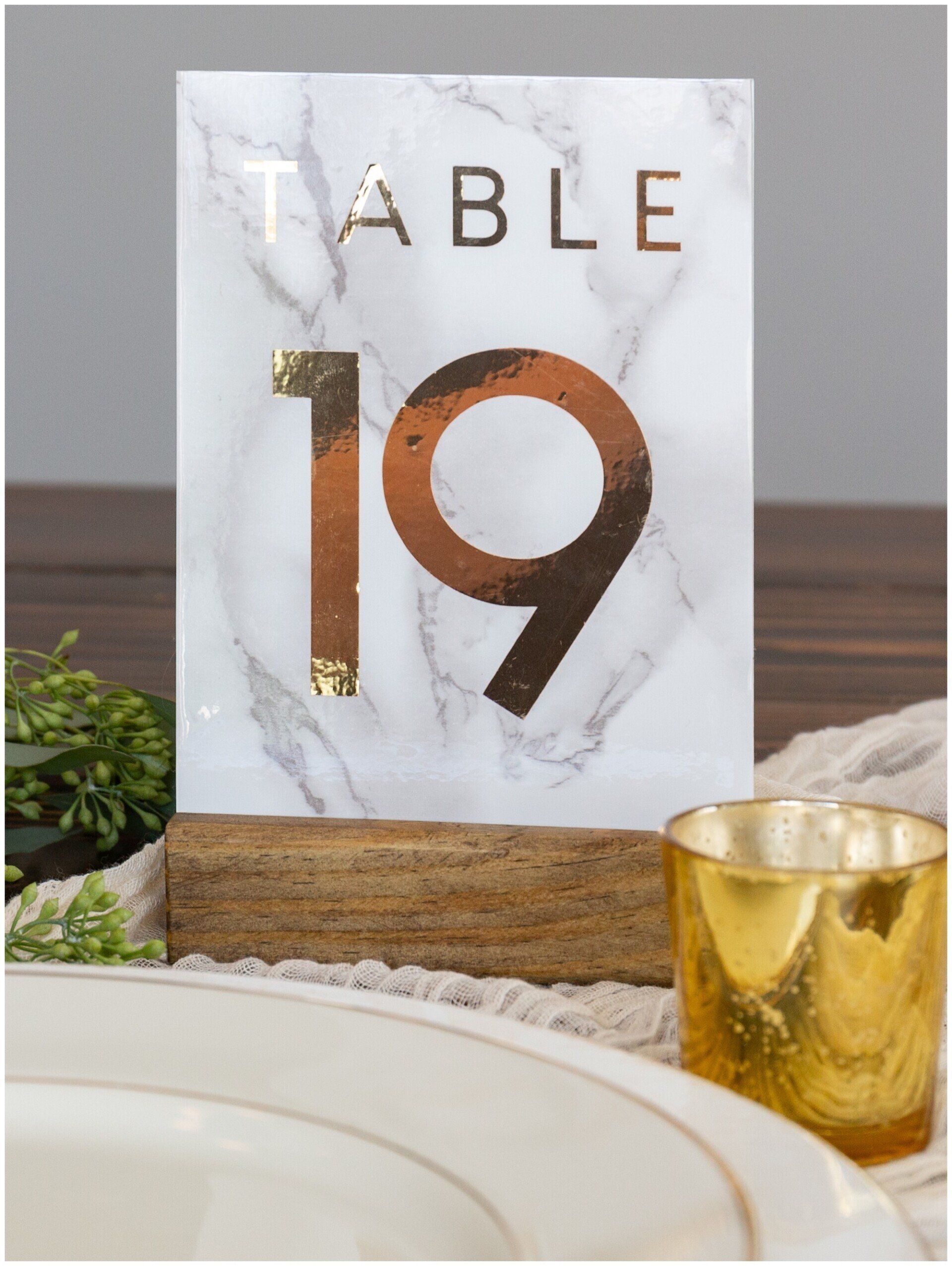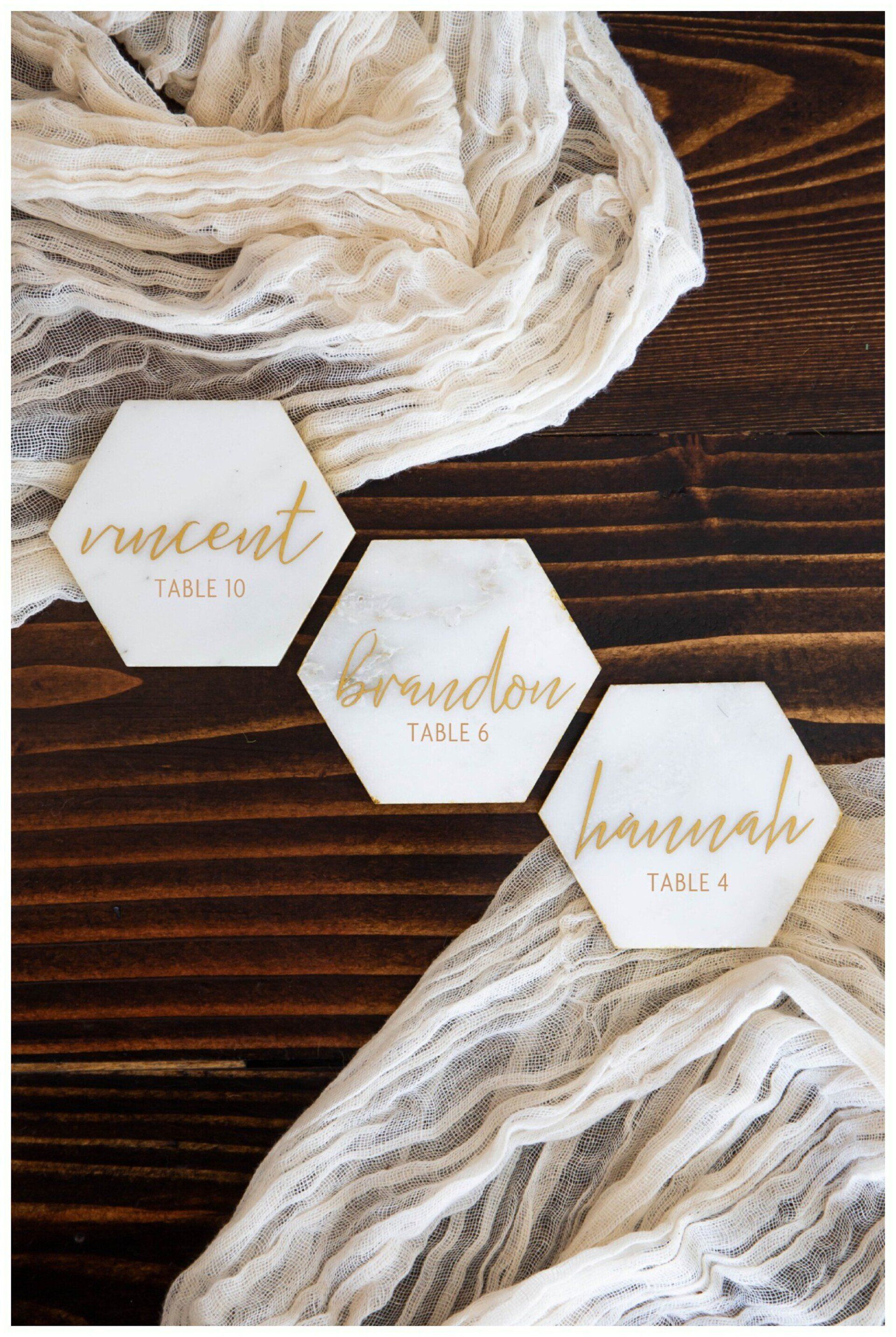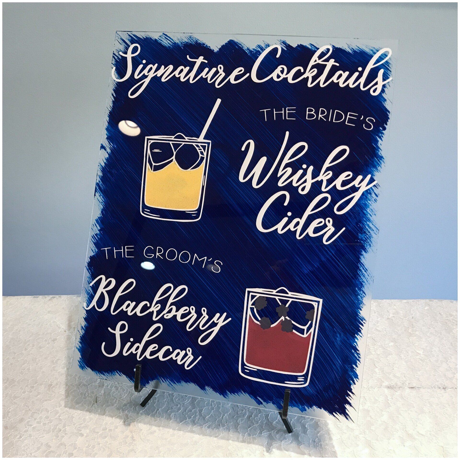 Personalize your wedding with pieces made on your choice of material from wood, clear and colored acrylic, mirror, chalkboard, printed products or even organics.